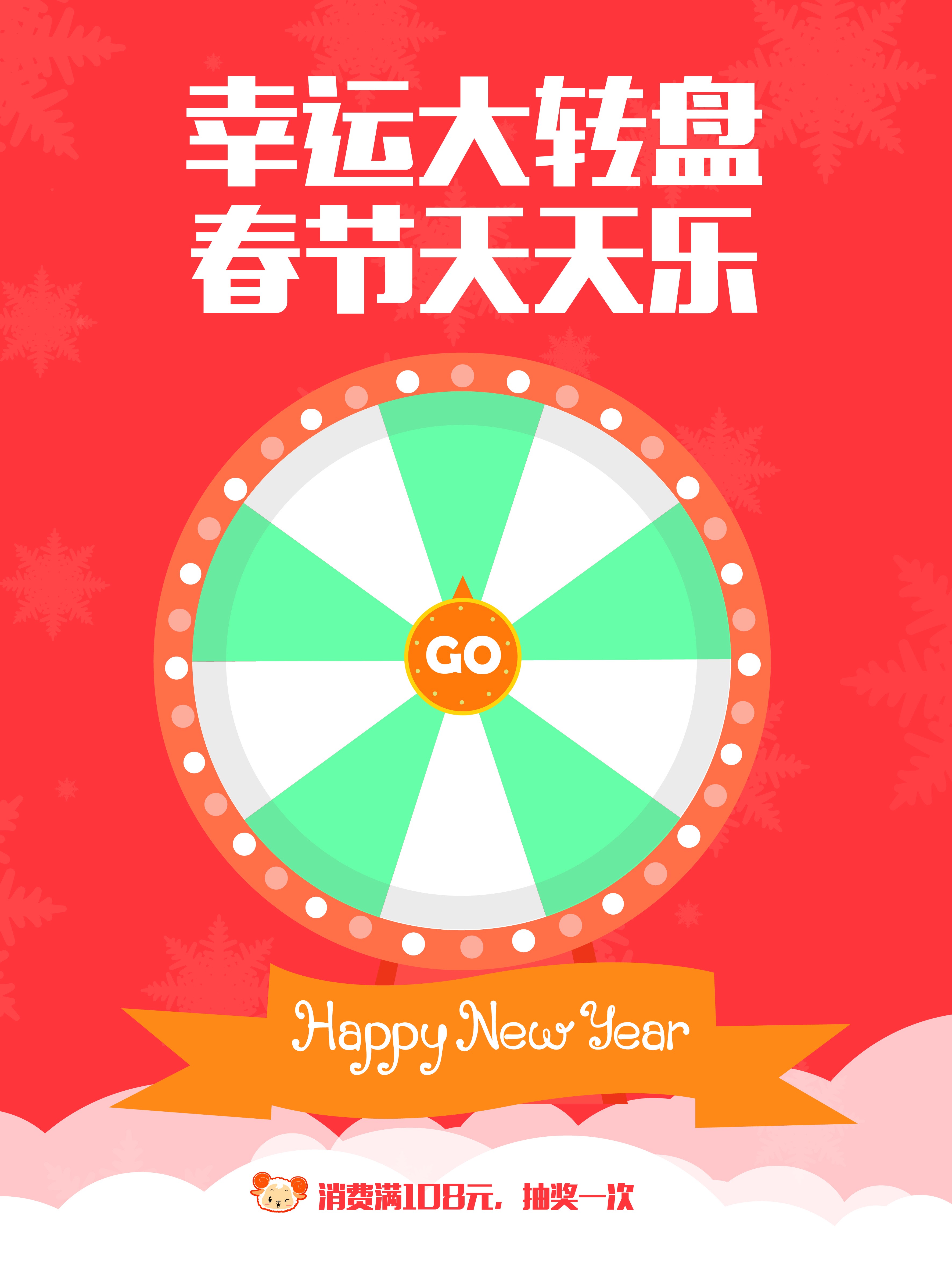 在任意门店,单次消费满108元,就可参加转盘抽奖,我们准备了各类神秘奖品,想知道新年的运气怎么样?来试试!