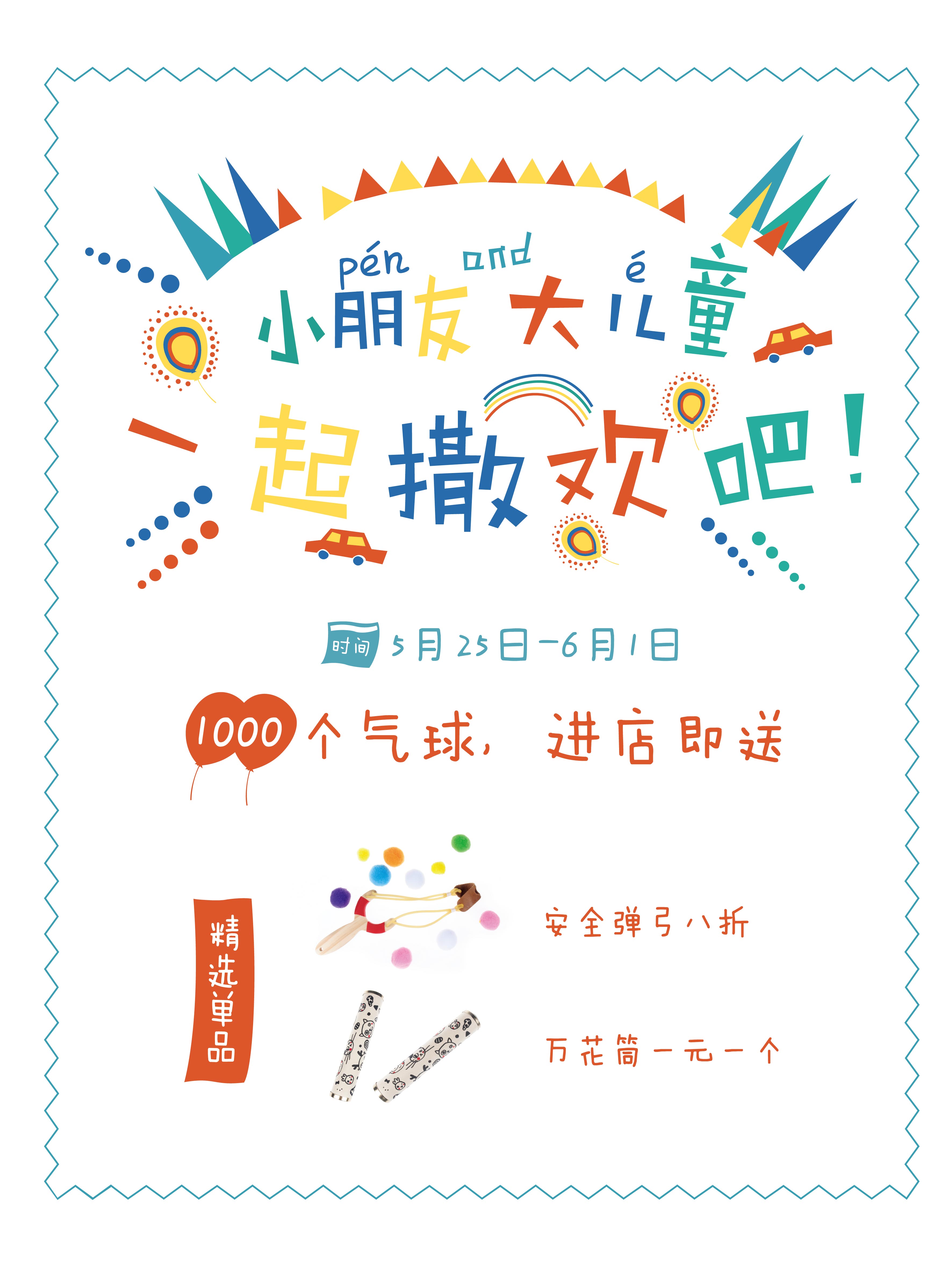 安全弹弓,进店即送五彩气球,还有只要一块钱就可以买到的万花筒。各位小朋友,大儿童们,为永葆赤子之心的节日,一起撒欢吧!