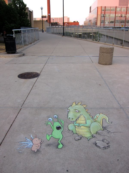 当你漫步于美国密歇根州的安阿伯市街头,您一定被这些充满创意的粉笔画所吸引。由当地一位名为Sluggo的艺术家创作小绿人总是会以令你意想不到的方式出现在会在各种公共设施傍边以及街头巷尾,或从地下突然蹦出。它的各种动作与眼神总会让我们觉得可爱无比,佩服设计师绝妙的想法与高超艺术造诣。