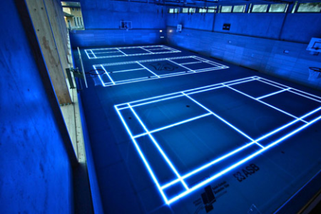 未分类现今的地面空间可谓是寸金尺土,很多体育场所为了节省空间通常都会用单一的场地来进行各项体育活动。于是我们看到篮球场上有排球场、羽毛球场甚至是足球场的各种边界条条,非常影响整个场馆的美观和观看者的视觉。为了在有限的地方进行各种体育运动又不影响场地美观,德国的一家公司开发了一套可随意更换各项运动地线标识框的玻璃地板。这玻璃地板的材质经过强化处理,在摩擦力、回弹性以及标线视觉清晰度方面都优于传统木地板,让运动场馆标线随意切换适应不同类的运动项目。还有,经过磨砂处理的玻璃表面,增加摩擦力的同时也避免了发光地线的反光效果。这玻璃很适合要求严格的运动场馆使用。